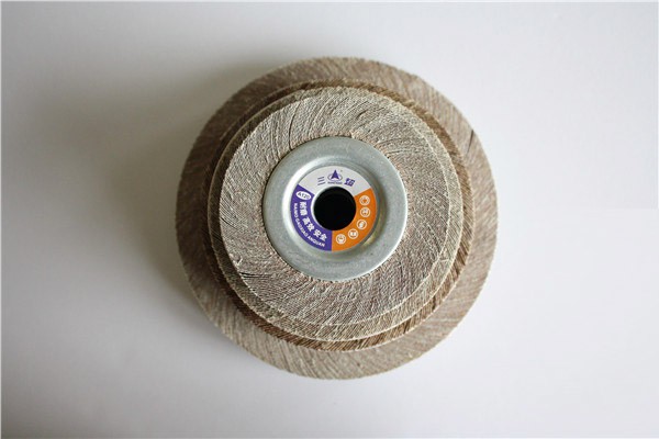 千葉輪,又名千頁輪、卡盤式頁輪,屬于涂附磨具的一種,每個(gè)產(chǎn)品以成百上千的紗布片粘合而成,故得名。它是以氧化鋁為磨料,基材為布基經(jīng)流水線制作成紗布,再由紗布層疊和全樹脂粘貼而成??ūP上下開凹槽將砂葉片固定在上下卡盤之間,砂葉片的內(nèi)側(cè)邊的兩端分別設(shè)置L形卡扣槽和緊固圈,緊固圈與卡扣槽固定連接,所述緊固圈經(jīng)膠液與卡扣槽固化粘結(jié)在一起,而成千頁輪,目前千葉輪分為直槽和U型槽口兩種。